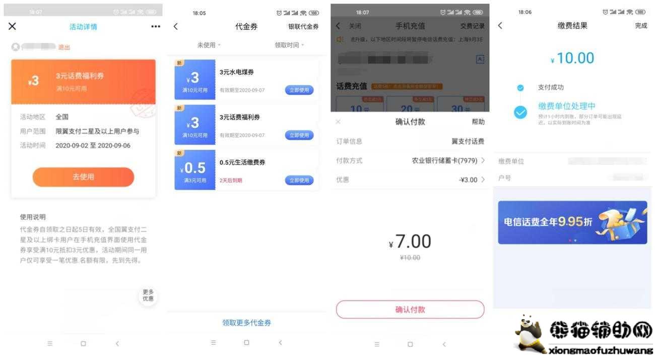 打开领取成后->下载翼支付APP->我的->代金券即可查看->只有电信能自定义数额充话费->移动联通可缴纳水电煤气