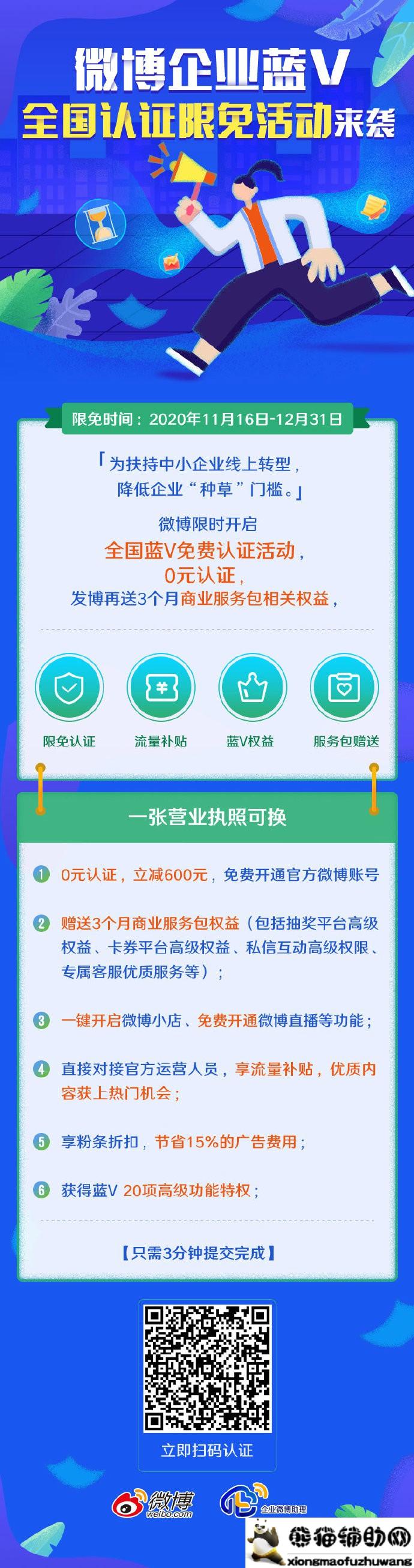 为了扶持中小企业线上转型,微博限时开启全国蓝V免费认证活动,免费开通微博官方账号,只需一张营业执照,即可快速办理,认证发博,还送3个月服务包相关权益;一键开通微博小店,免费开启微博直播等权益。