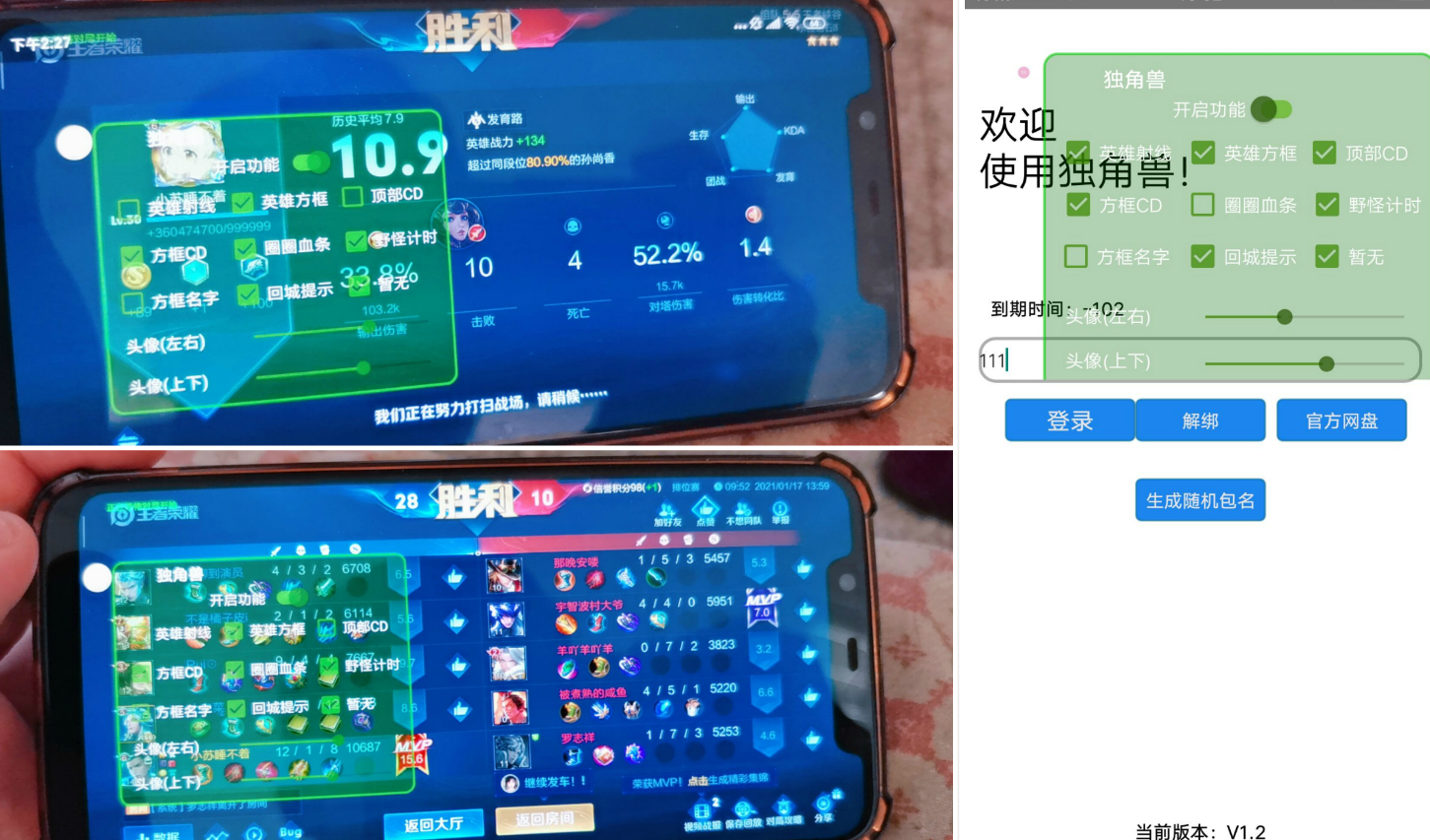 王者新项目内部UNICORN独角兽。独家天卡随机生成安装包,地图透视-英雄血条,人物射线-方框技能,CD计时-野怪计时,极致丝滑-精简流畅。全网独家编写源码每个手机安装都是独立随机特征码生成安装包安装。本辅助无需root兼容所有安卓手机。免责声明: