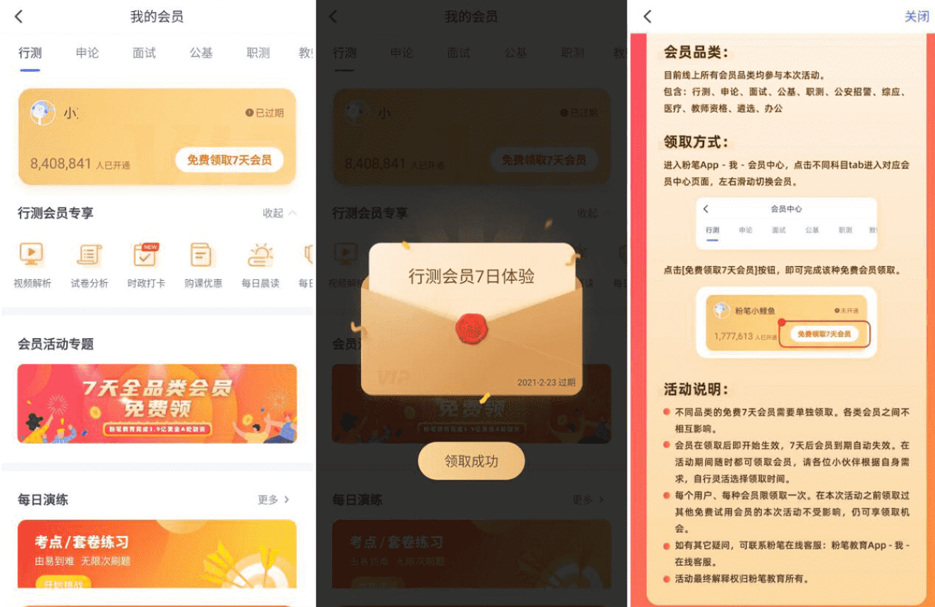 下载粉笔教育APP->登录后->我->左上角->会员中心->进来就可以看见免费领取7天会员->领取即可