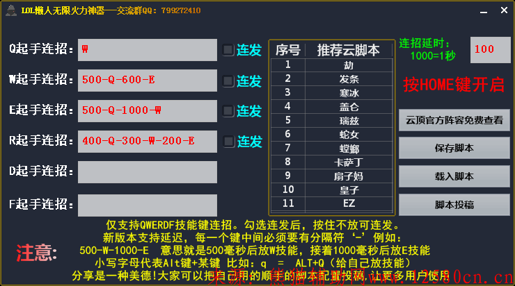 3.增加自定义延迟功能。现在支持连招脚本中 自定义增加延迟比如: 200-Q-500-W-1000-R(200毫秒后释放Q技能,接着等待500毫秒后释放W,最后再等待1000毫秒后释放R技能) 加了延迟的必须用‘-’来分割