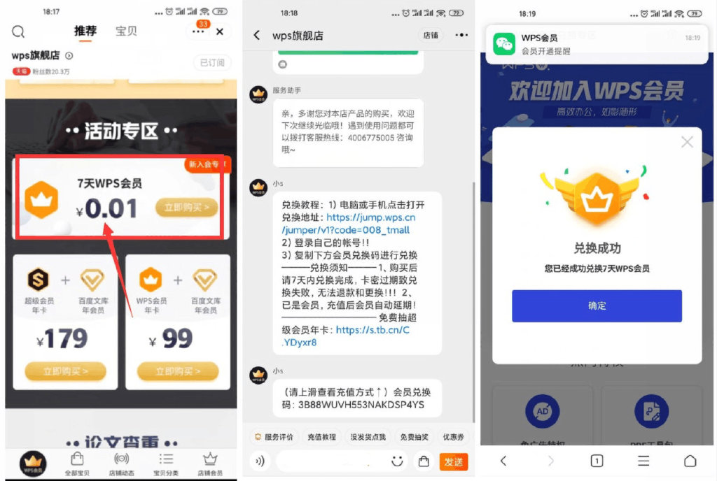 1、淘宝店铺搜索“WPS旗舰店”->进店->首页->下拉点页面->活动专区->7天WPS会员 0.01元
