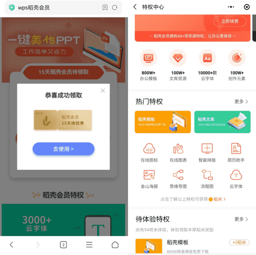 稻壳会员拥有免费下载付费云字体、模板、会员专属皮肤等特权!每个链接可以领取15天,每天可以领4次,领取崩溃了的,等一段时间再去领取!