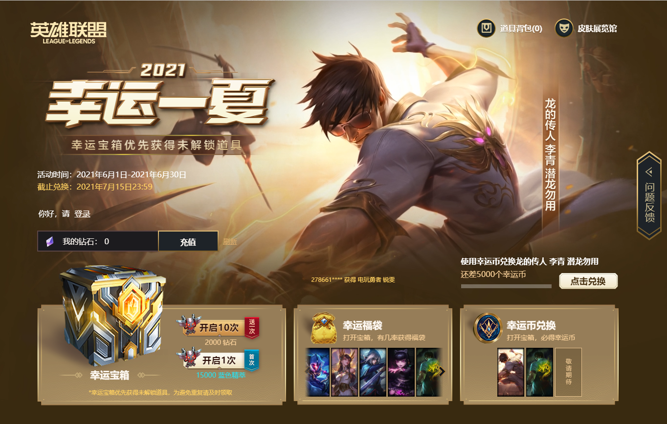 LOL2021幸运一夏 幸运币兑龙的传人李青潜龙勿用