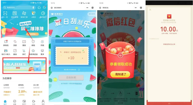 2、按照提示完成开通->会提示去刮奖(没弹窗就去首页点轮播图 “新人刮刮乐” 进去)