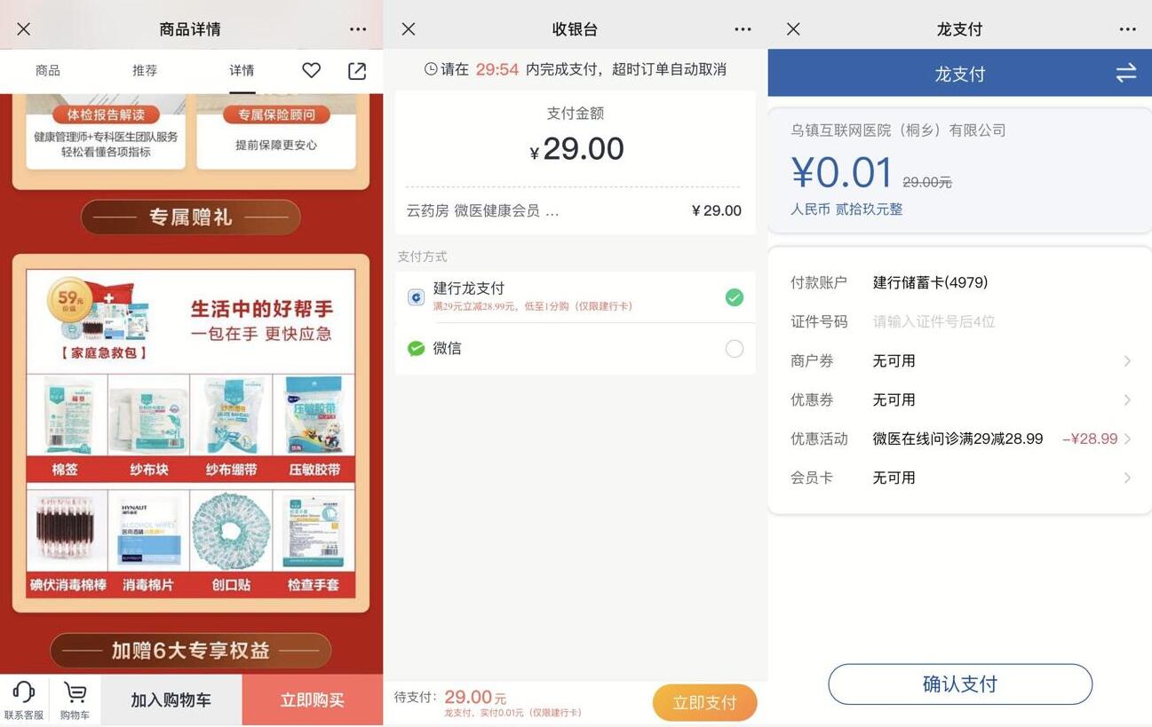 微信打开登录购买->选择建行龙支付->页面有显示减28.9元就支付0.01元->包邮的