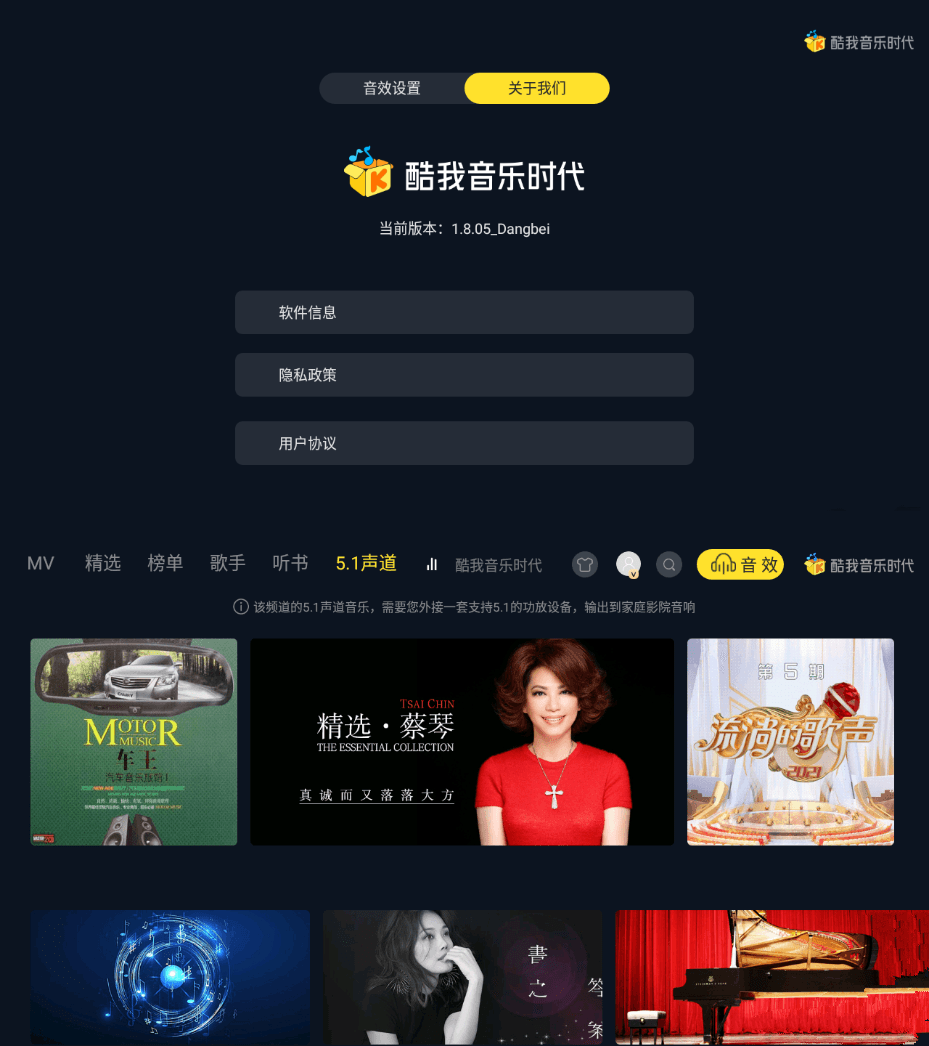 酷我音乐时代TV版,是最近推出的一款依托OTT大屏端的无损音质正版音乐软件,酷我音乐电视版致力于提供5.1声道音乐,支持5.1的功放设备,输出到家庭影院音响。为用户提供高品质音乐、无损音乐下载服务。