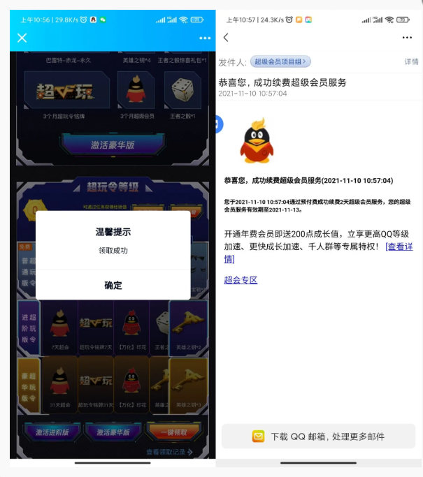 手机QQ打开下拉页面->点第一个2天超会->领取秒到!