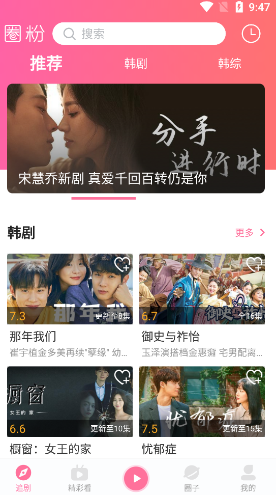 圈粉TV是一款专业看韩剧的神器,给大家分享的版本已经去除10分钟观看登录限制,去除未登录不能投屏限制,软件画质几乎都是高清,秒播不卡顿。