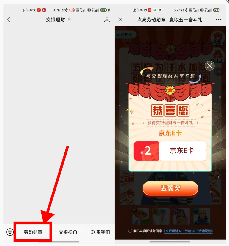 1、微信关注公众号“交银理财”->左下“劳动勋章”->点亮所有勋章
