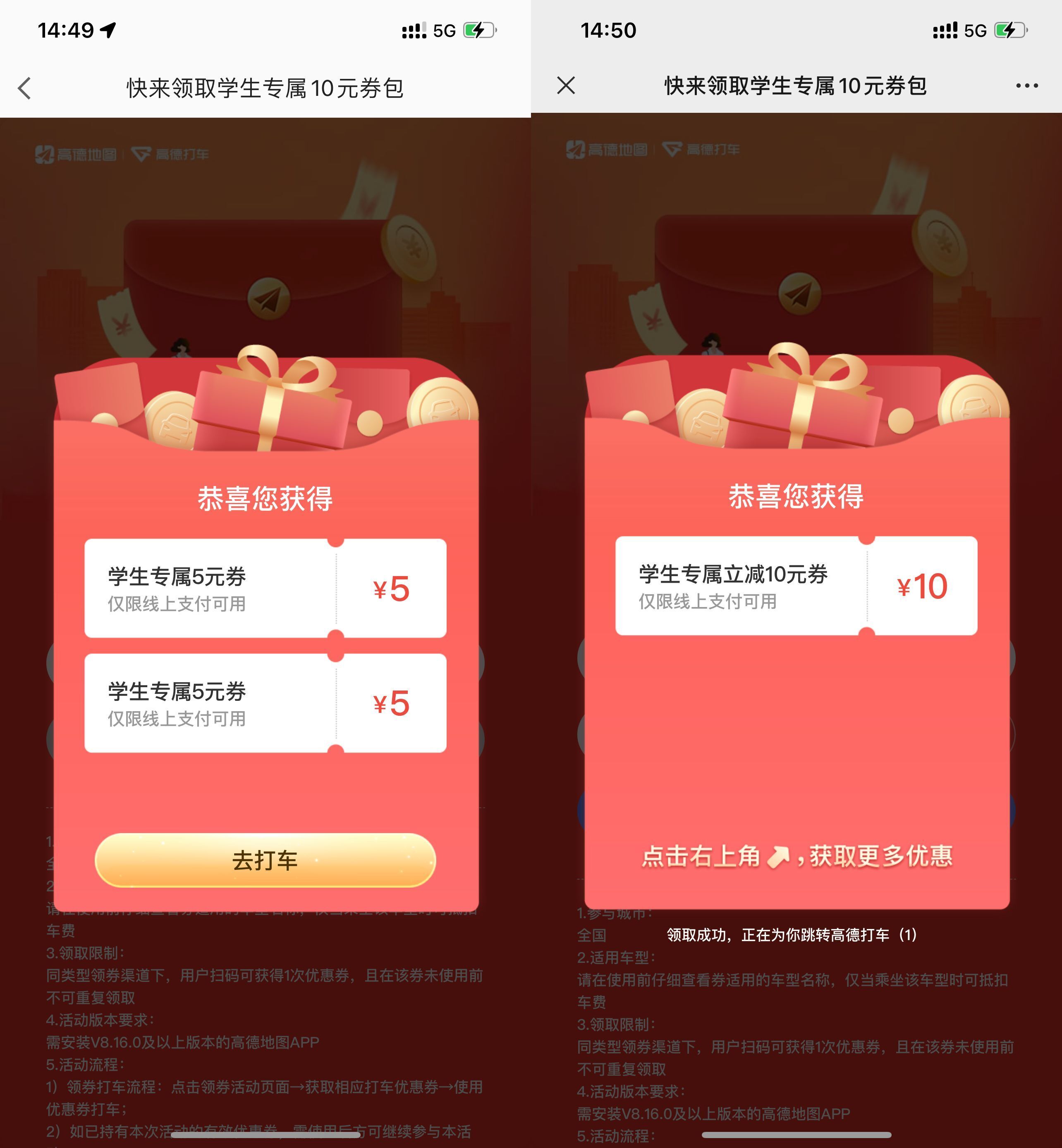 可以领到2张5元券 或 1张10元无门槛券