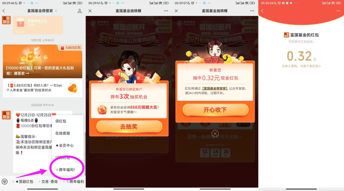 微信关注【富国基金微管家】菜单栏右进入抽三次,亲测0.32元微信红包,